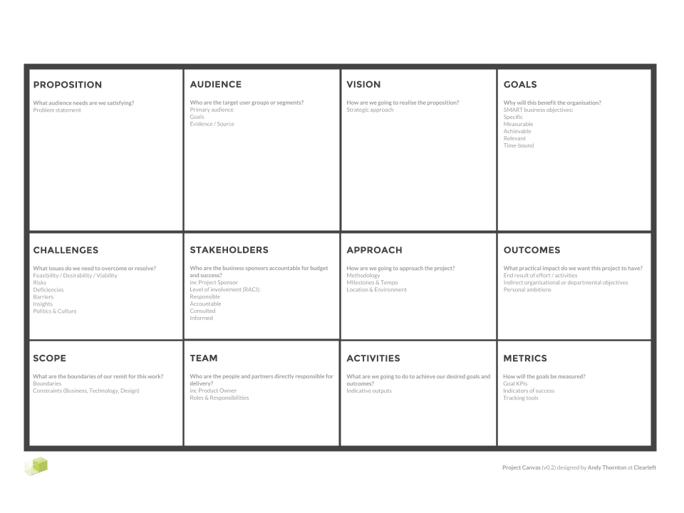 The Project Canvas is a living document, so it’s never ultimately set in stone. It can and should be modified throughout the course of the project as and when necessary. It’s intended to be made visible in the halls and on the walls of working areas, reviewed, recapped and remixed in however many slide decks and marketing materials as necessary to demonstrate a focused and aligned team.